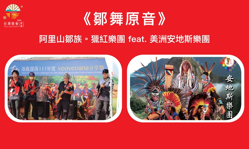 今回は、阿里山ツォウ族の猟紅楽団とソウルに満ちたアンデス楽団とのコラボレーションにより、民族を超えたパフォーマンス『鄒舞原音』を披露します。プログラムは「音を道とし、リズムを脈とし、共鳴を根とする」をコンセプトとし、ツォウ族の古調と躍動するリズムの融合を通じ、民族を超えた文化の脈絡をつなぎます。オーストロネシア語族と世界の先住民文明が同じルーツを持ち、地域を越えて音によって共鳴し合うという深いつながりを象徴しています。今回のパフォーマンスは音楽のコラボレーションだけでなく、儀式的文化のルーツ探求と国際交流を象徴するものでもあります。音を架け橋、リズムを旗として、嘉義の文化的自信とオーストロネシア文明の精神的原点を世界に伝えます。